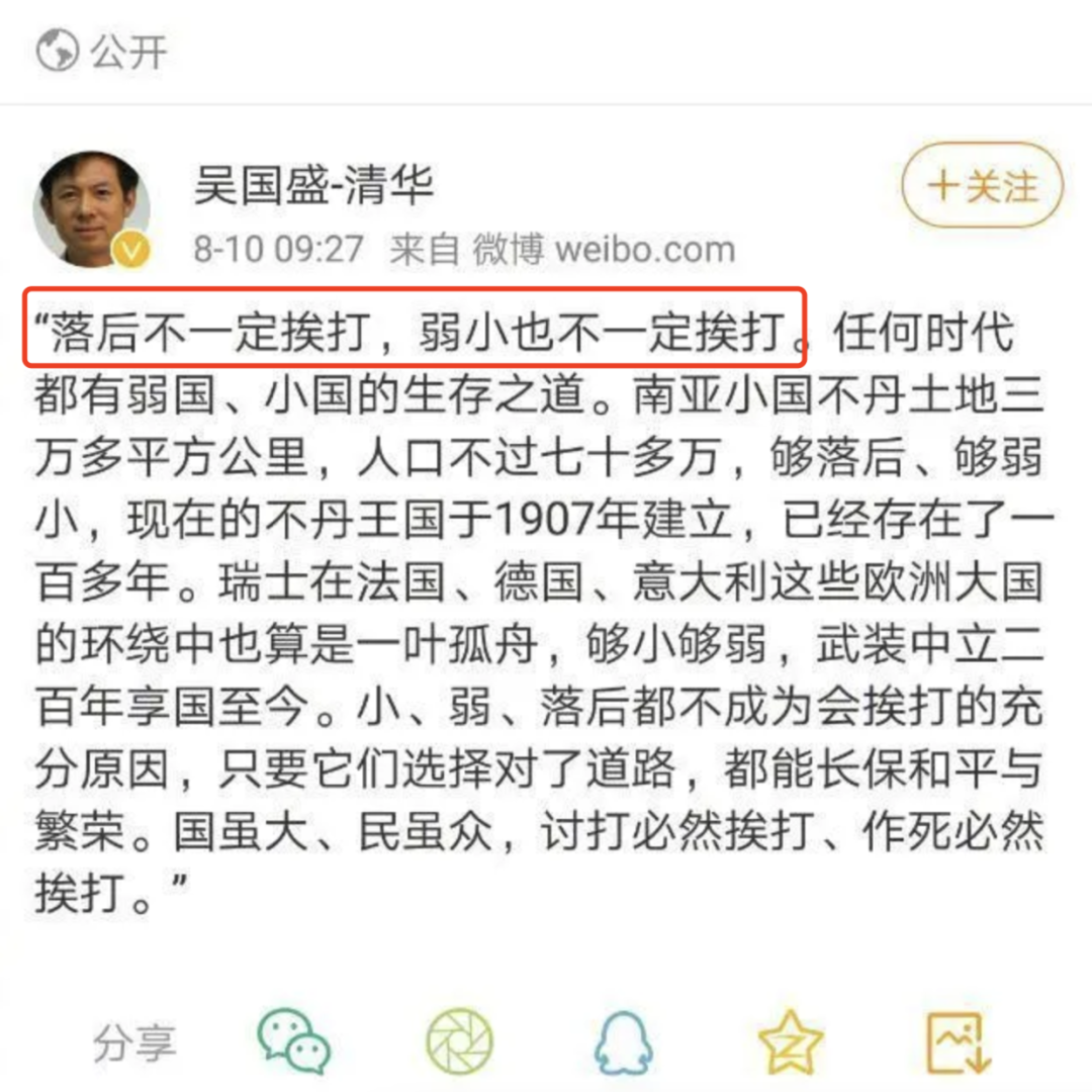 清華教授吳國盛曾有過迷惑發言:落後不一定捱打,弱小也不一定捱打……國雖大、民雖眾,討打必然捱打、作死必然捱打。