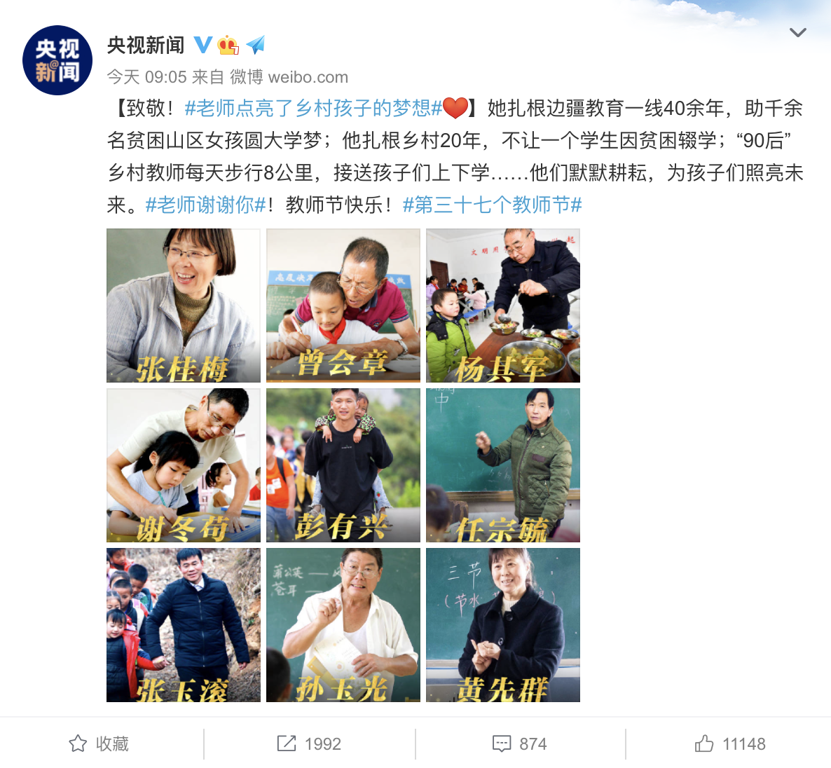 央視新聞還用“張桂梅”、“曾會章”、“楊其軍”、“謝冬苟”、“彭有興”、“任宗毓”、“張玉滾”、“孫玉光”、“黃先羣”這些老師和“中國特色社會主義的堅定信仰者和忠實實踐者”、“道德上的合格者”、“智者”、“人類文明的傳承者”、“教育扶貧的先行者”、“做學生健康成長的指導者和引路人”這些標籤重新定義了“師者”這個詞彙。