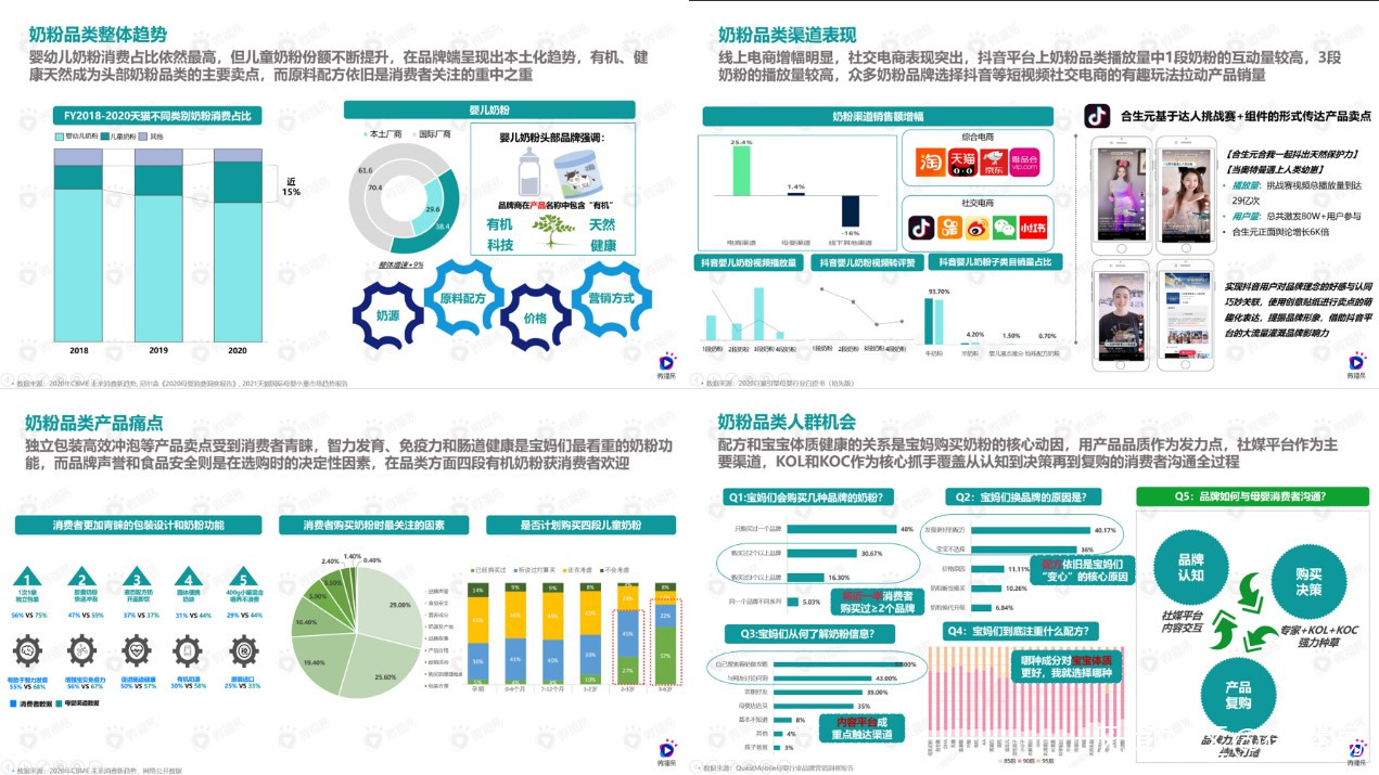 從品類整體趨勢、渠道表現、產品痛點和人羣機會四部分,以奶粉、輔食、紙尿褲三個品類為重點剖析其機會和痛點。