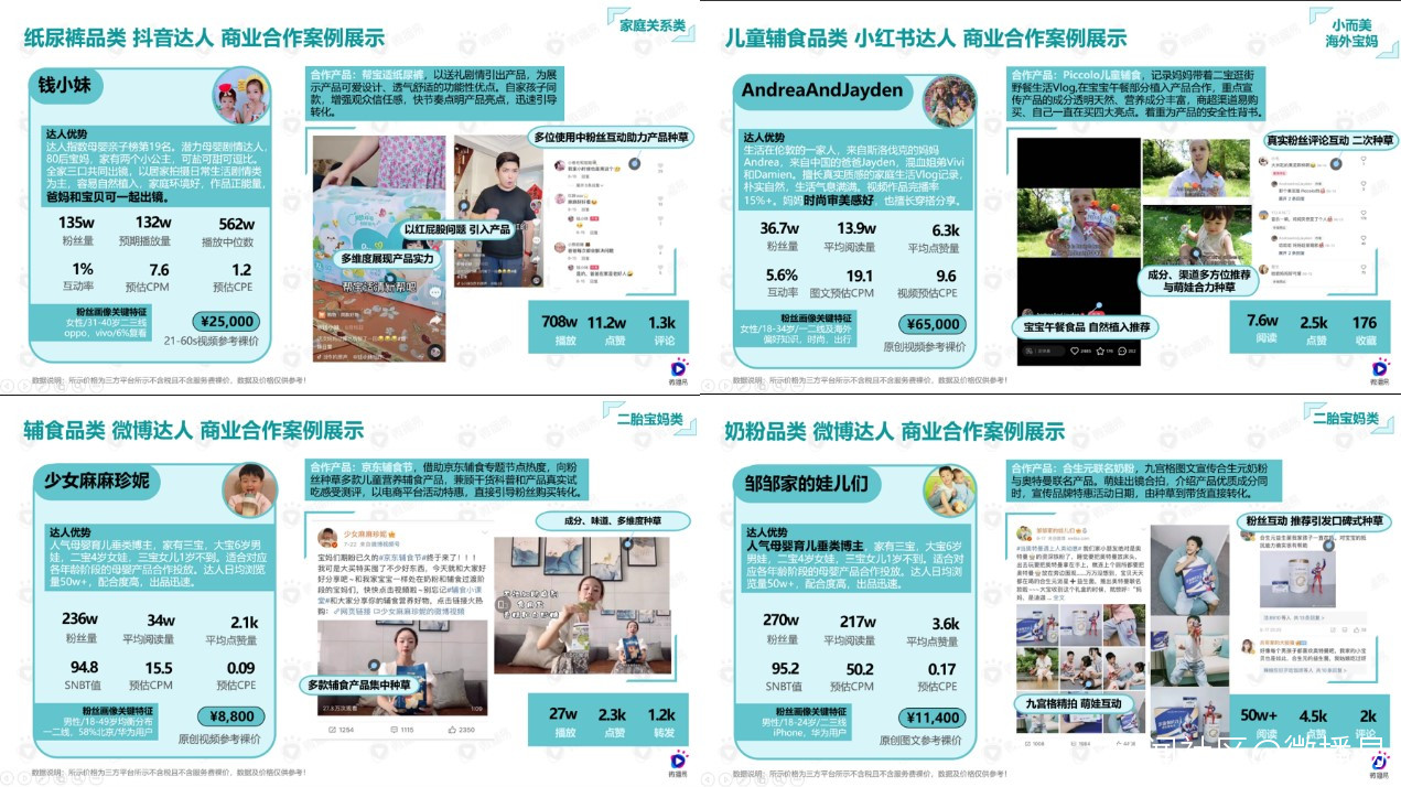 在方案最後,微播易通過影響力和興趣維度尋找呼應母嬰消費者身份認同、多元化標籤身份的KOL,用相似性方式擴展母嬰消費者已有興趣圈層縮短品牌信任培養路徑,通過內容產出和達人數據維度結合社媒平台對母嬰內容的興趣差異為品牌主附上優質達人推薦列表。