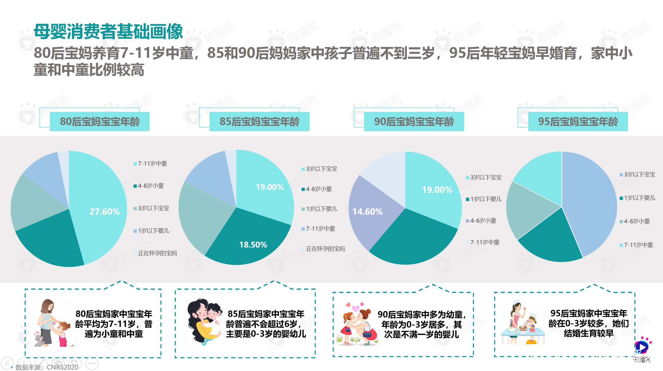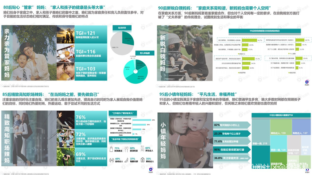 **95****後年輕小鎮媽媽:**平凡生活,幸福養娃是她們的生活態度,她們普遍早生多育,絕大多數時間都在照顧孩子和家人,她們逐漸摒棄上一代落後的經驗育兒法,重視專業育兒,形成自己的育兒觀念,養成健康的母嬰消費方式。
