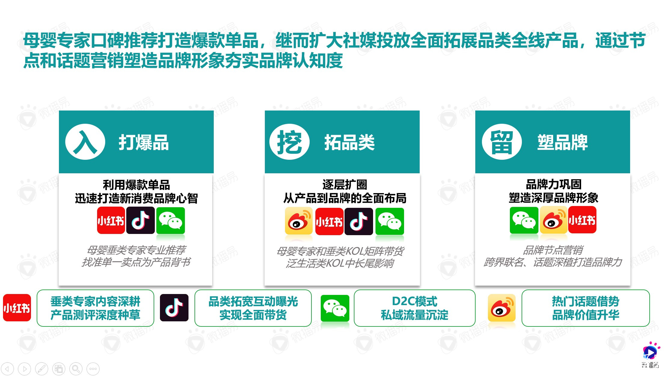 對於母嬰品牌來説,我們提出了兩個營銷場景,老牌母嬰品牌利用社媒建立品牌IP的過程,以及新消費母嬰品牌利用社交媒體打造爆款單品的過程。