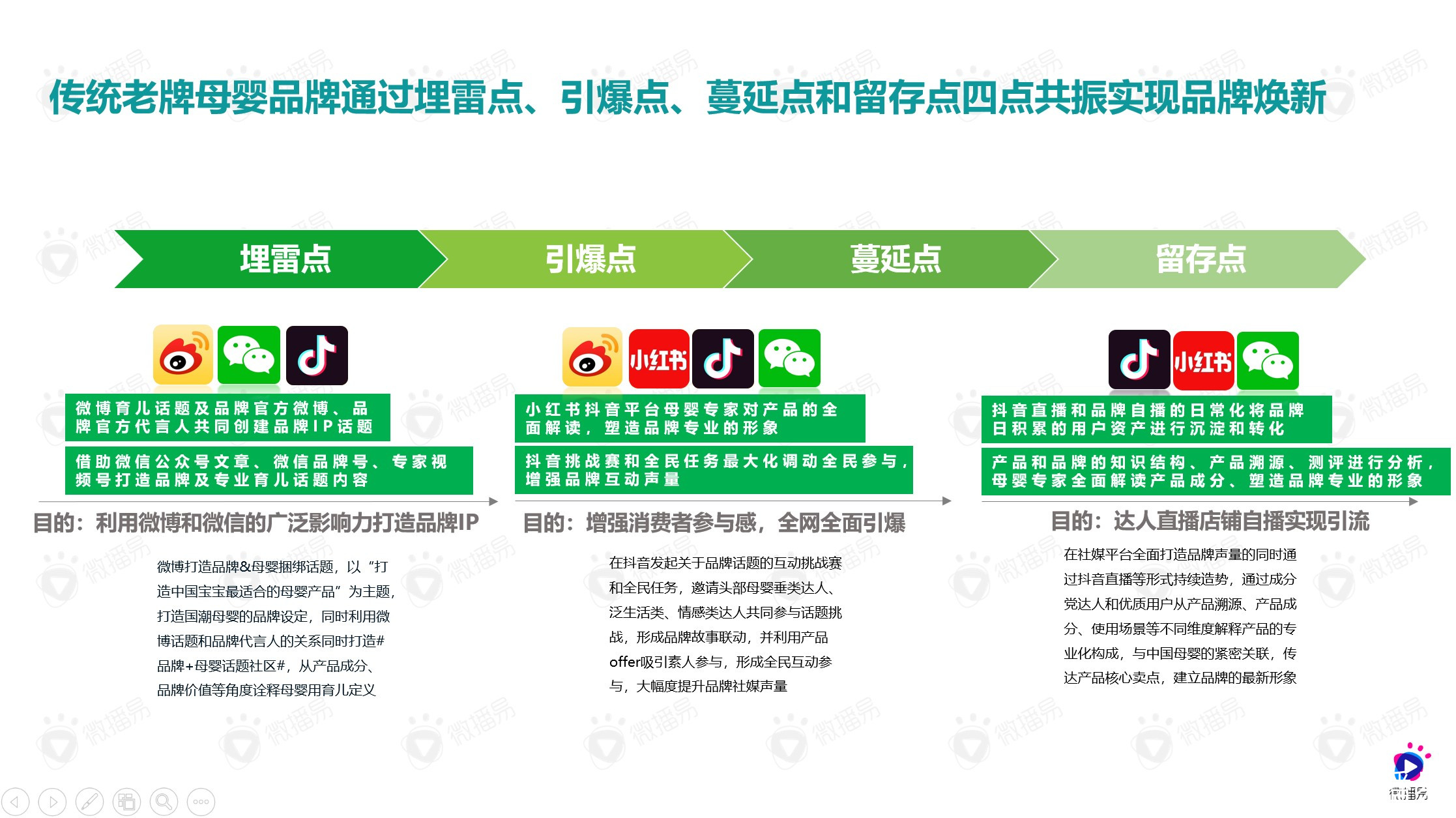 老牌母嬰品牌適合利用社媒為品牌煥新IP,我們建議傳統老牌母嬰品牌以品牌日作為煥新引爆點,利用雙微在大流量平台搭建煥新人設,利用小紅書平台深耕品牌煥新專業賣點,抖音平台作為煥新帶貨渠道。