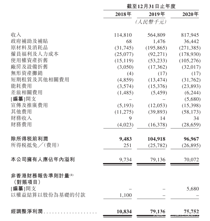 招股書顯示,在過去的2018年、2019年和2020年三個財政年度,海倫司的營業收入分別為1.15億、5.65億和 8.18億元人民幣,相應的淨利潤分別為人民幣 973.4萬、7,913.6萬和 7,007.2萬元人民幣。