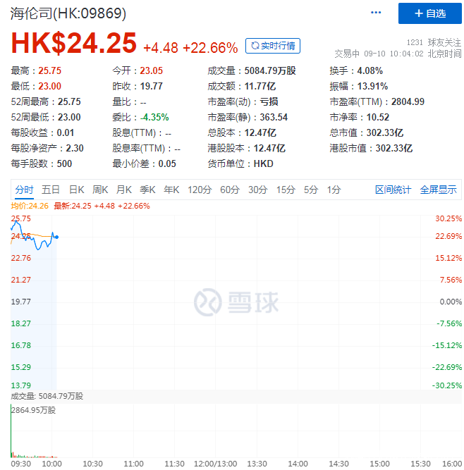 9月10日,海倫司成功登陸港交所,早盤高開超16%,盤中市值一度突破300億港元。