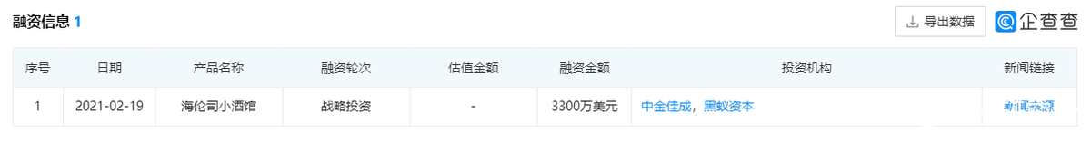 鑑於健康的現金流,海倫司成立至今共拿到了一輪融資,據企查查信息顯示為2021年2月19日由中金佳成、黑蟻資本共同投資的3000萬美元戰略投資。