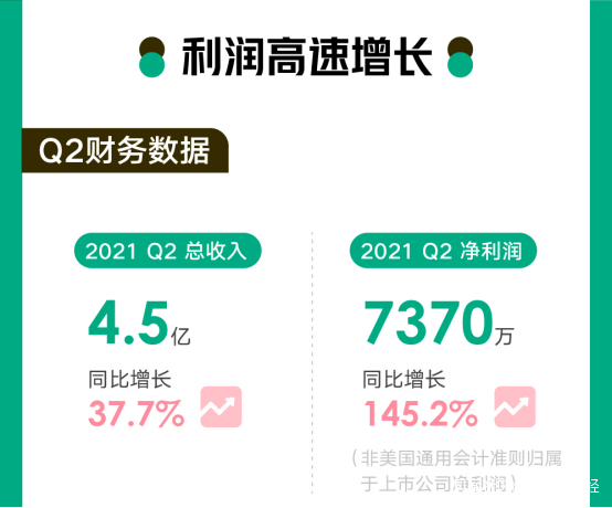 財報顯示,2021年第二季度,新氧科技總收入4.518億元(7,000萬美元)創新高,同比增長37.7%,較2020年同期的3.282億元人民幣增長37.7%,超過公司指引上限4.5億元人民幣。歸屬於上市公司的淨利潤為5,760萬元人民幣(890萬美元),比去年同期增長26倍。非美國通用會計準則歸屬於上市公司淨利潤7,370萬元(890萬美元),同比增長145.2%。
