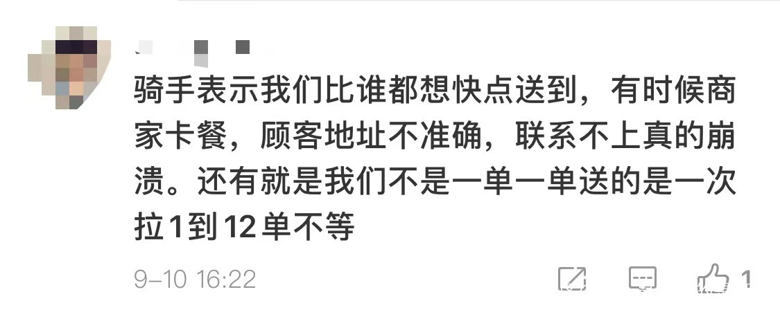 還有騎手錶示,自己比誰都想快點送到,但總有商家卡餐、顧客地址不準確或聯繫不上的崩潰事件出現。