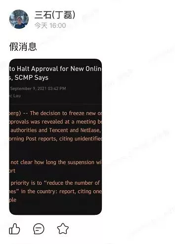 網易CEO丁磊火速在公司內網闢謠稱,暫停遊戲版號審批是假消息。