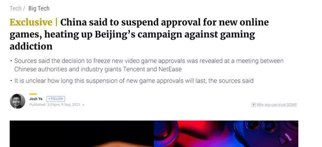 9月9日下午,南華早報援引知情人士稱,中國將暫停新網遊的審批。