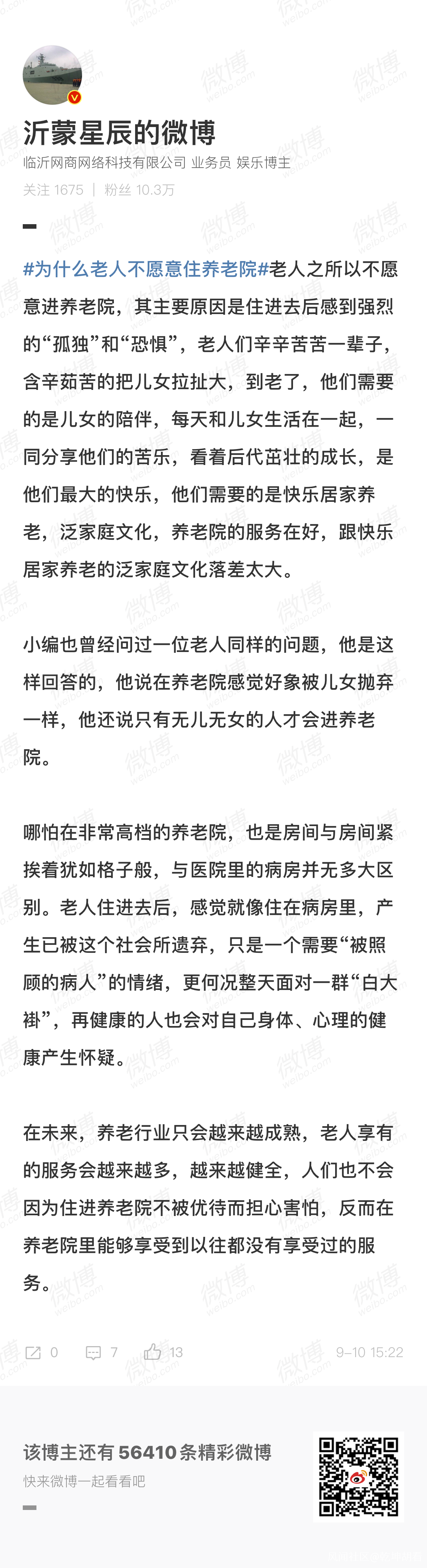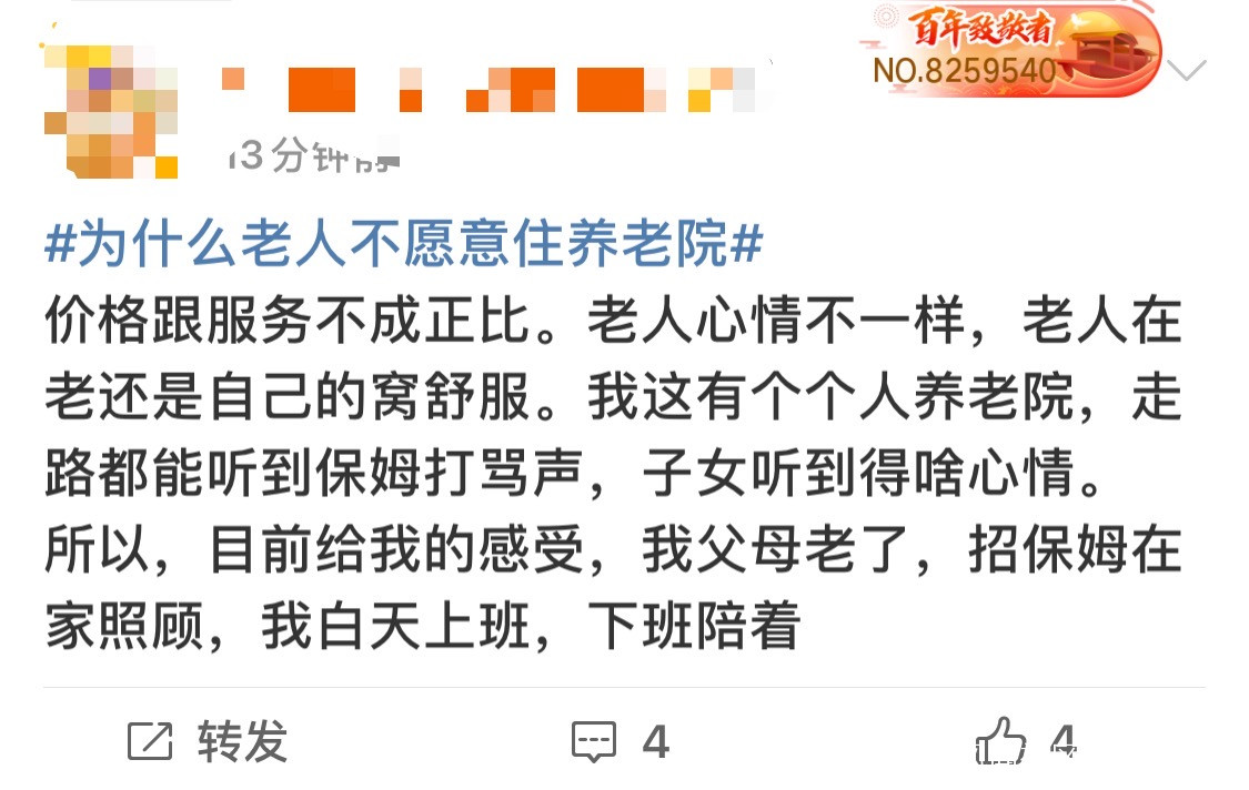 所以有網友説,養老院價格跟服務不成正比。老人還是在自己的家舒服。並説自己父母老時,就白天上班,下班陪着。