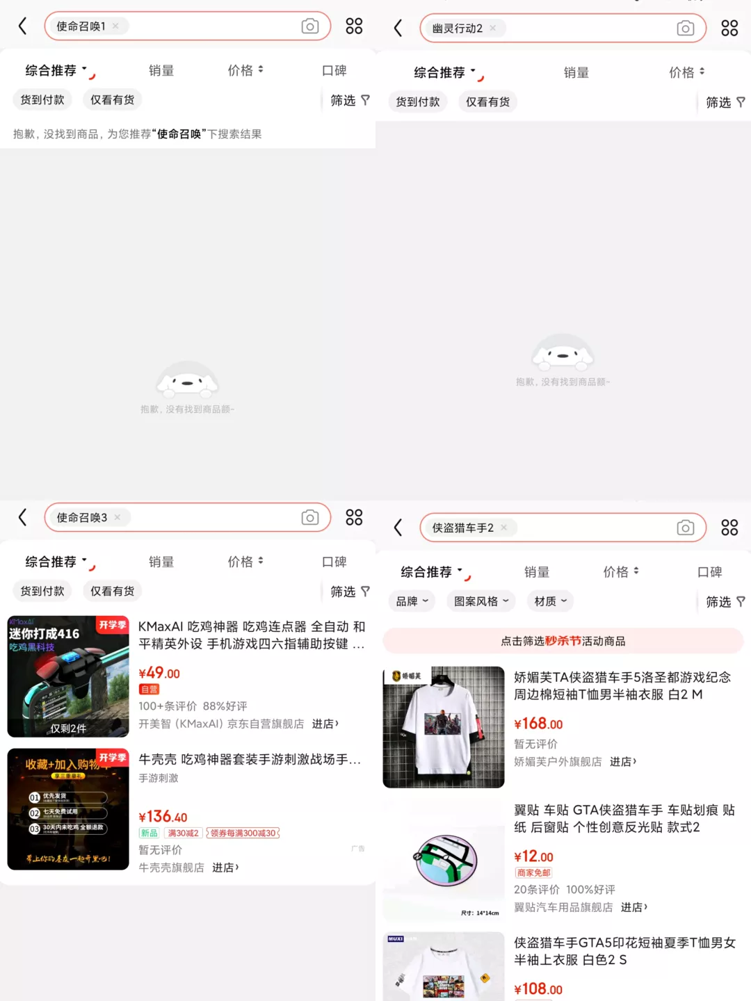 燃財經在京東平台隨即搜索了上述87款禁令中的遊戲,其顯示的結果或為“抱歉,沒有找到商品”或為與搜索產品的周邊商品。