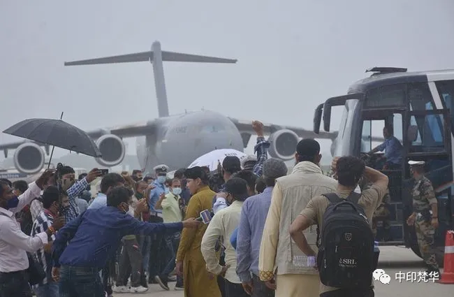 從阿富汗撤離的印度公民和阿富汗難民抵達印度新德里附近Hindon空軍基地,圖源:澎湃新聞