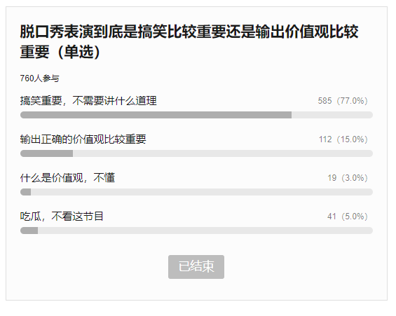 豆瓣小組2020年發起的投票結果也表明了大家的態度,“脱口秀表演到底是搞笑重要還是輸出價值觀比較重要”,77%的人認為搞笑重要。