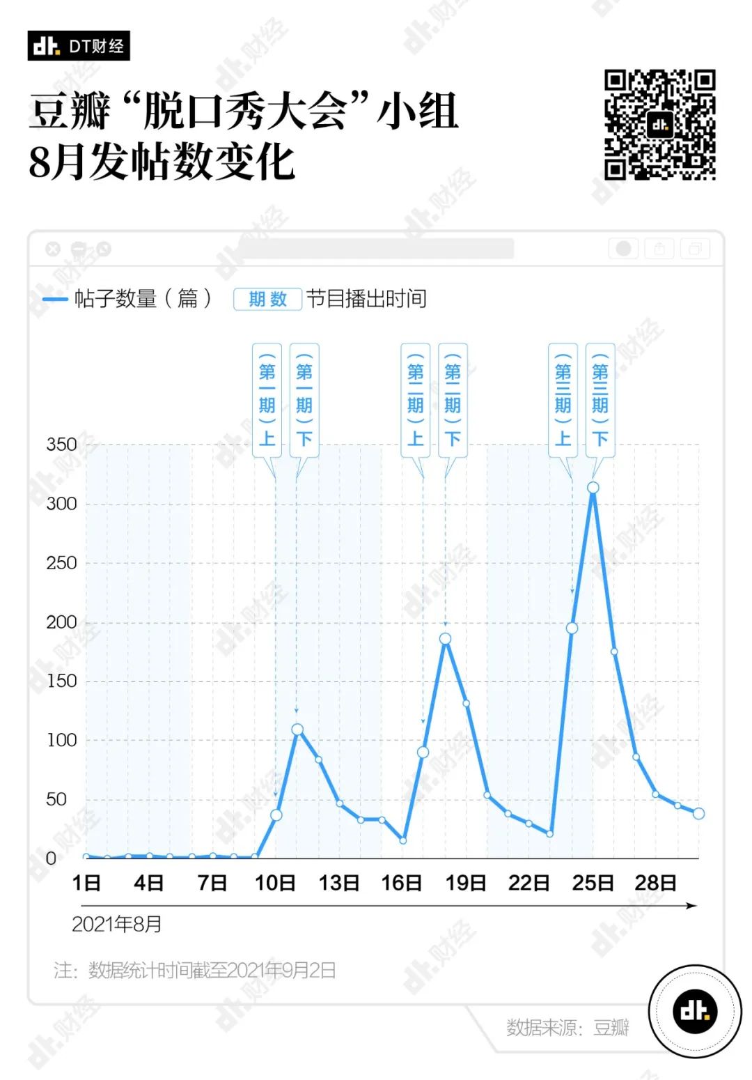 而在更垂直的社區圈層中,隨着節目推進,討論也逐漸升温。“脱口秀大會”小組升至豆瓣追劇小組TOP 2,第三期節目播出期間的發帖量,差不多是第一期時的3倍。