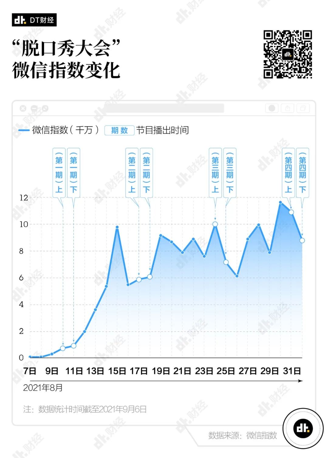 微信指數綜合了微信搜索、視頻號、公眾號文章、網頁及部分廣告渠道,一定程度上可以代表公號報道的關注度,和熟人社交場域的活躍度。“脱口秀大會”的微信指數在首期節目播出後逐漸攀升,第5天(8月15日)攀上熱度高點,隨後一直保持在高位,甚至在8月30日熱度過億,遠高於同期其他綜藝節目。
