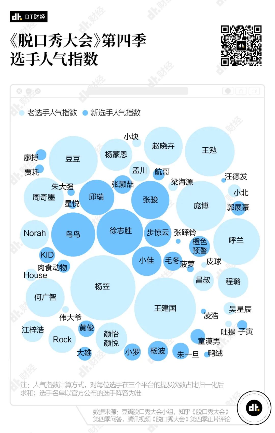 參加這一季《脱口秀大會》的選手中,有一半是第一次參加節目的新人。為了大致看一下新人為新一年脱口秀影響力做出多少貢獻,我們綜合了幾個平台評論/帖子中各個選手被提及的次數,簡單製作了一個人氣指數。