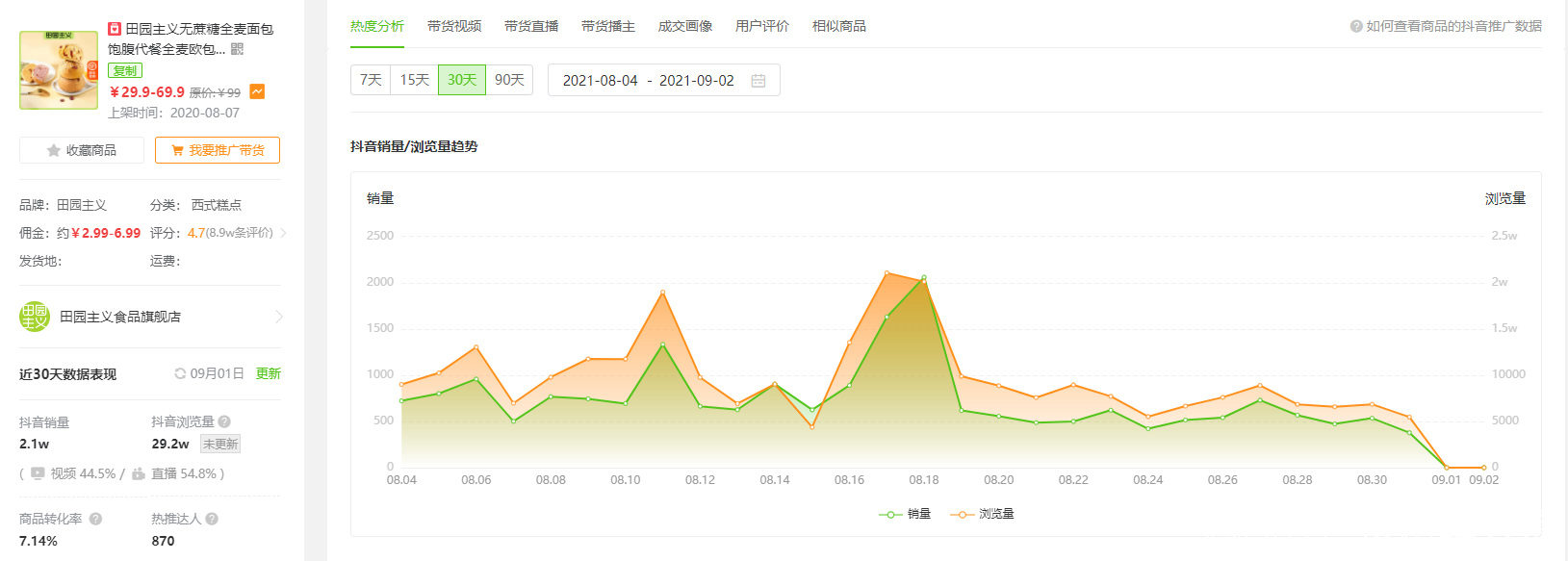 據飛瓜數據顯示,抖音平台近30日(2021年8月4日至2021年9月2日)內,有870位帶貨播主推廣過這款田園主義全麥麪包,關聯視頻138個,關聯直播達7294場。