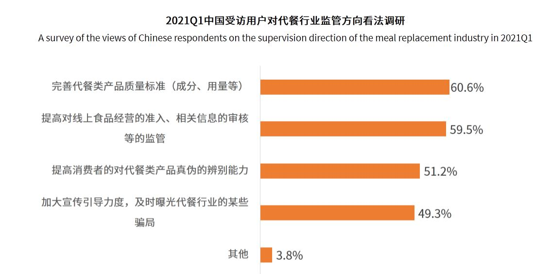 事實上,這也是消費者羣體對健康食品行業的一致看法。以代餐品類為例,據艾媒諮詢發佈的《2021年一季度中國代餐行業發展及市場調研分析報告》顯示,六成左右受訪用户認為代餐行業需要完善代餐類產品質量標準,並加強對線上代餐食品經營的准入審核監管;超半數受訪者認為需要提高消費者對代餐產品真偽的辨別能力,監管機構及時曝光行業騙局。
