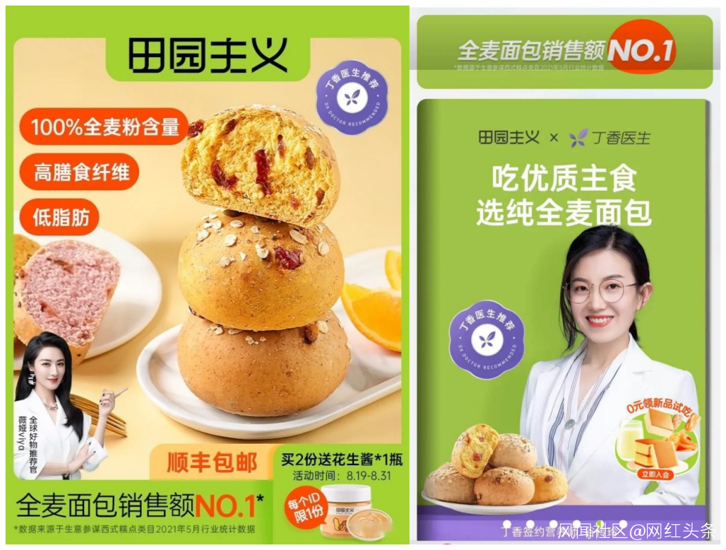 (田園主義此次涉事全麥麪包有薇婭、丁香醫生背書推薦/圖源淘寶)