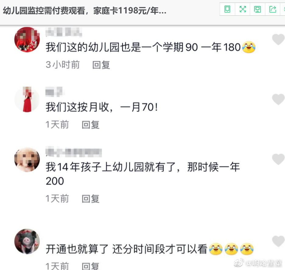 @一位不願透露姓名的地理學者:這不是收費貴不貴的問題,而是付費看監控這個事本身就不合理。幼兒園無死角裝監控,這很有必要,特別是遇事可以輔助快速查明真相、釐清責任。但是家長付費觀看幼兒園監控,這個事大大不妥。