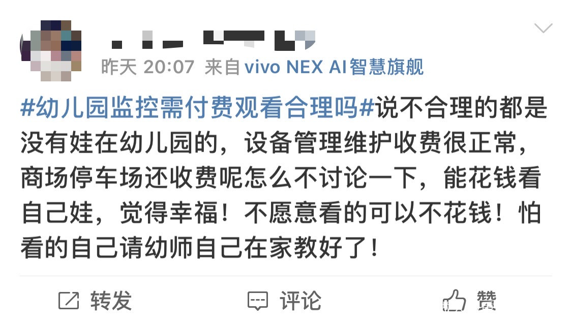 還有網友認為,監控安裝本身有維護運營成本,收費是應該的,不合理的是幼兒園藉機斂財高收費。