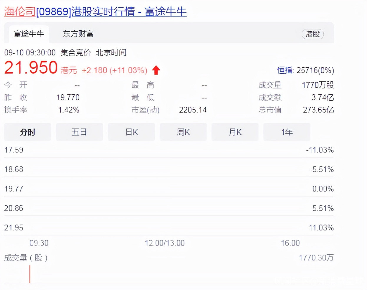 9月10日早上9點,海倫司登陸港交所,成為香港股票市場上的“線下酒館第一股”。截止北京時間9:30,海倫司報21.950港元,成交量1770萬股,總市值達273.65億。