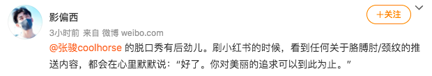 微博上就有網友評論,如果不是張駿説了,她還真不知道男性原來真的不注意“頸紋”這回事,有時候女生,確實是對於外貌,過於吹毛求疵。