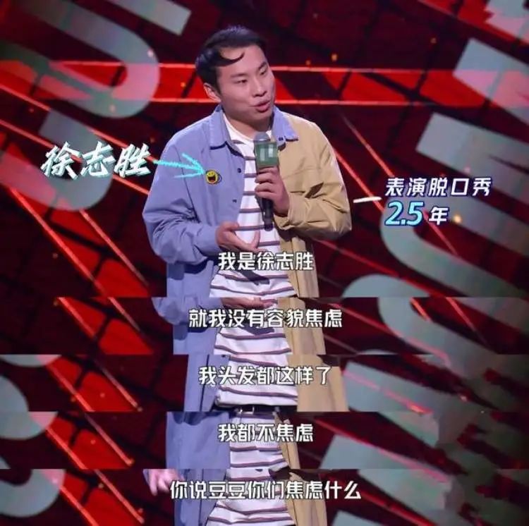 當前面一堆人講了自己的“容貌焦慮”,徐志勝緊接着歡天喜地地上台,蹦出一句“我沒有容貌焦慮”的時候,你很難不為這句話爆笑。