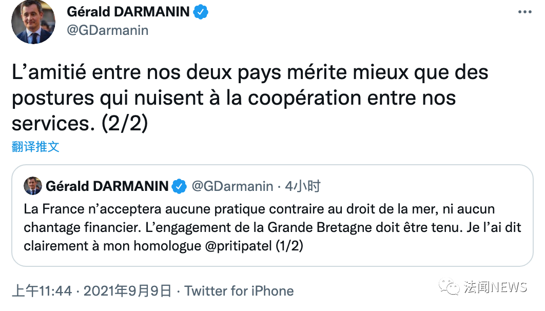 在週一給英國部長的信中,法國內政部長Gérald Darmanin警告説:“在海上使用驅趕措施可能對我們的合作產生負面影響。在海上,保障人的生命優先於對國籍、地位和移民政策的考慮,應嚴格遵守組織海上搜救的國際海事法。”