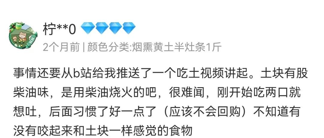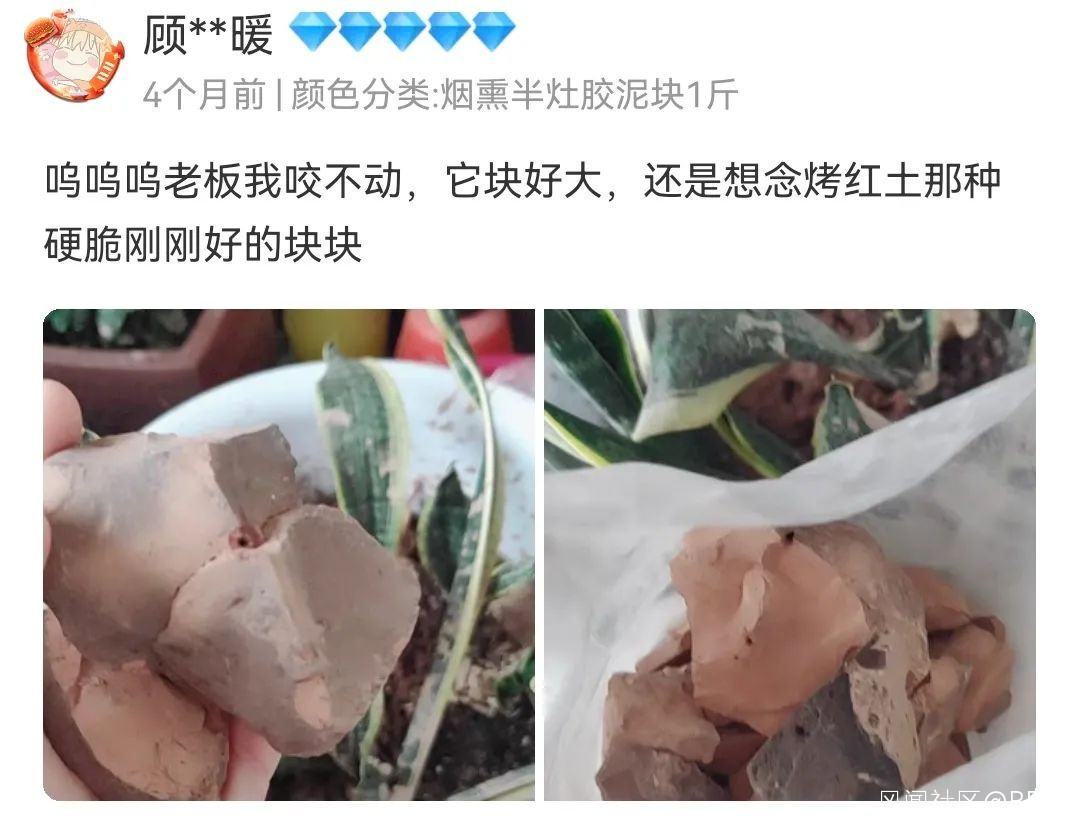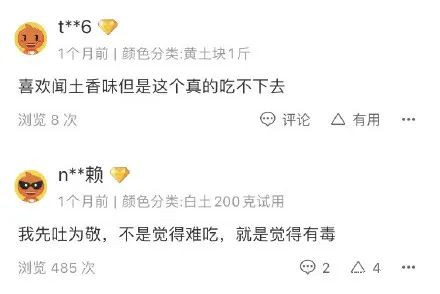 不同地區產出的土塊味道不同,甚至就算是同一個店家售賣的同一款土,口感也無法做到一成不變。這種類似於盲盒的刺激與新鮮感更助長了異食癖患者們對網購土塊的熱愛。