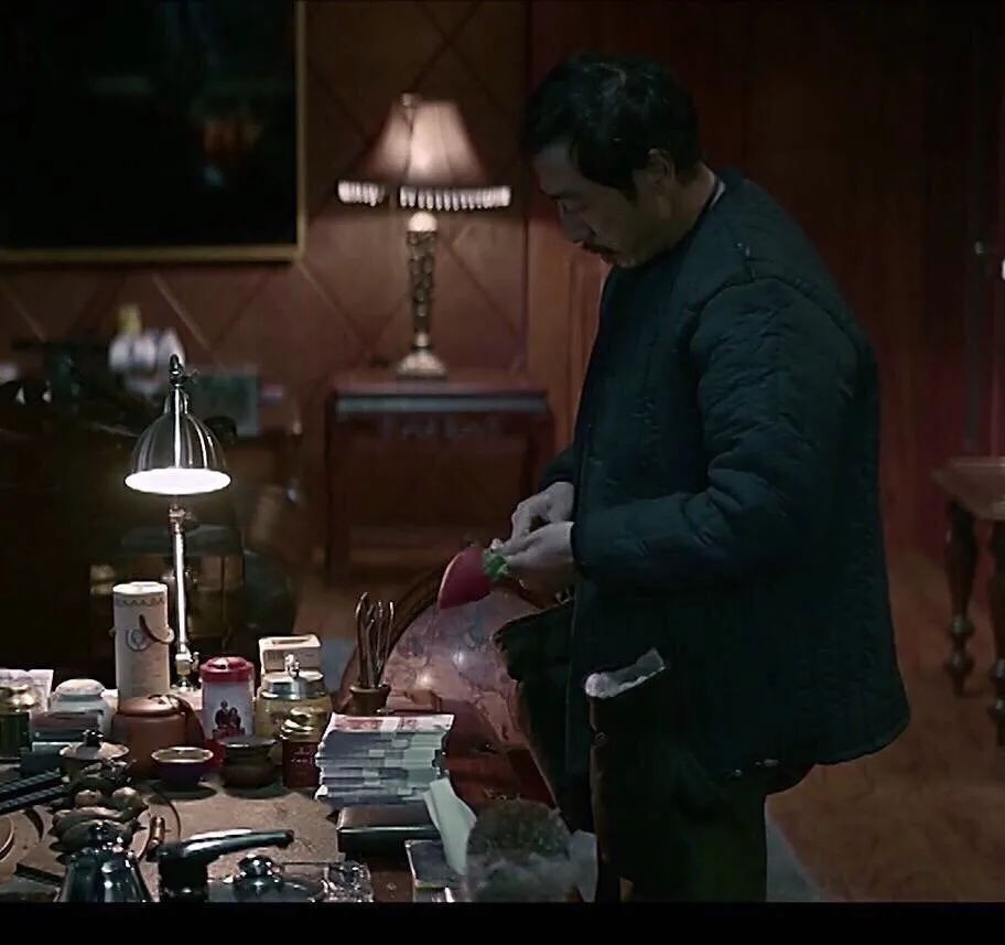 演李豐田間隙,穿着大破襖也不忘翻幾頁,把劇組的人嚇一跳:眼前的「殺手」有了文化,不但可怕,而且陰險。