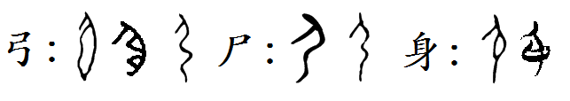 你可能覺得奇怪,弓和身差別挺大的呀,怎麼會混呢?因為你看到的楷書是不像,但在甲骨文里長得像呀。而且還有一個“屍”字,這哥仨就像一個媽生的。