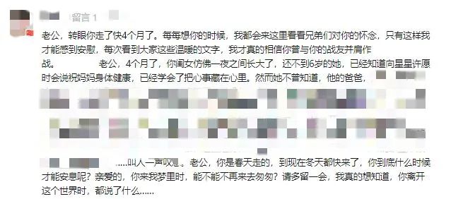 老公,轉眼你走了快4個月了。每每想你的時候,我都會來這裏看看兄弟們對你的懷念,只有這樣我才能感到安慰,每次看到大家這些温暖的文字,我才真的相信你曾與你的戰友並肩作戰。