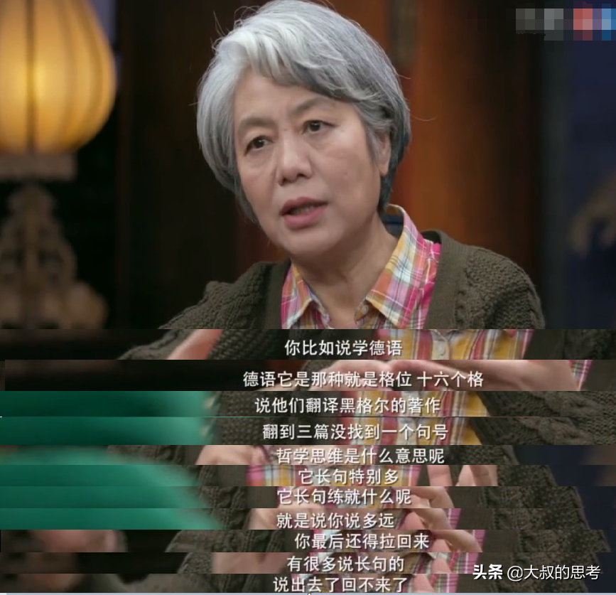 然後她從語言詞彙和寫作方面來例證自己的論點,她説德語和中文的區別就很大,比如翻譯德國作家黑格爾的作品,三篇沒找到一個句號,長句特別多,這種長句雖然多,但到最後還能拉回來,這就是一種哲學思維或者長遠思維的訓練。有很多長句説出來,是拉不回來的。