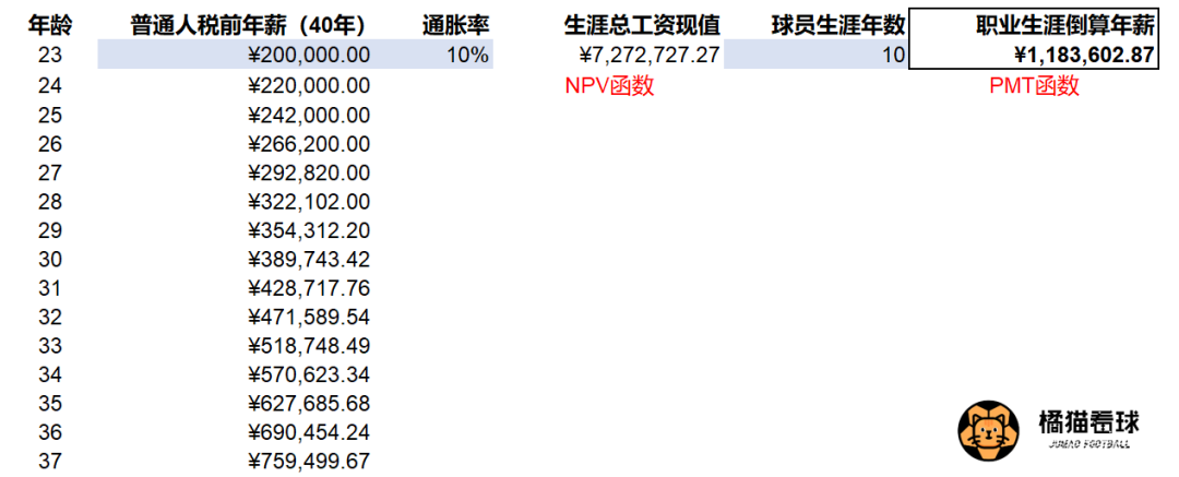 筆者簡單地參照北京社會平均工資和假定的通脹率,把一個能“體面”生活的普通人工作40年總工資的現值,按照10年的足球職業生涯長度折算,得到一個“體面”中超球員的税前年薪約為180萬元。