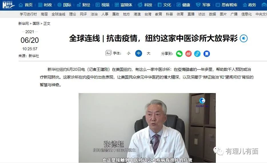 2021年6月份,德爾塔病毒在美國強烈反彈時,新華社報道紐約華人中醫師利用中藥幫助普通美國人治療和預防新冠,取得良好的療效。被其救治的非華裔病患説,她在感染新冠病毒後,曾經昏死過去,也被送往醫院急救,但“最終還是中醫救了我的命”。