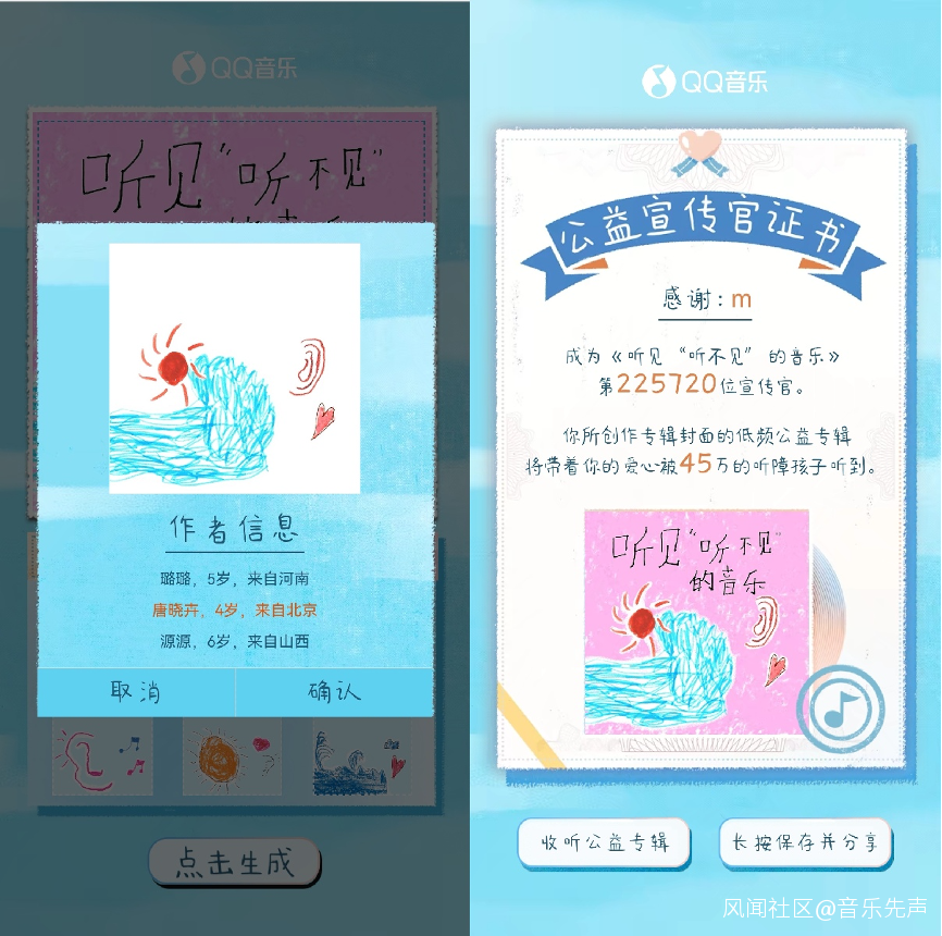 今天,不少人的朋友圈都被一張“公益宣傳官證書”圖片所佔領。專輯封面中的“背景”、“元素”、“標題”都來自全國各地的中高頻聽力損失的孩子們,網友可以挑選他們親手用畫筆描繪的從低頻音樂中“聽到”的美好畫面,以共創的方式完成自己的專輯封面,成為國內首張低頻公益專輯《聽見“聽不見”的音樂》的公益宣傳官。