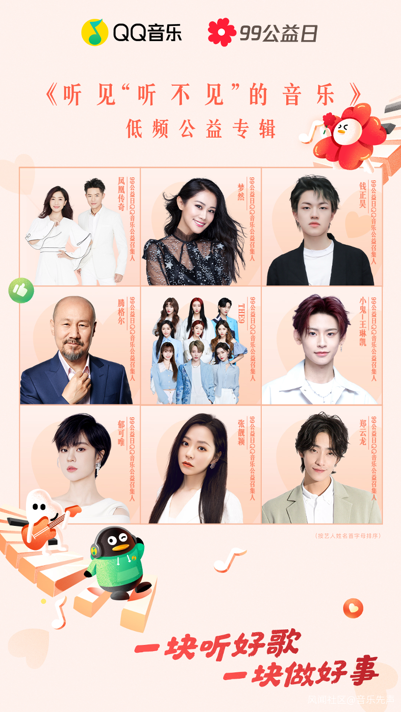 在“一塊聽好歌,一塊做好事”的主題思路下,QQ音樂項目團隊從今年6月開始籌備,並在99公益日來臨之際聯合鳳凰傳奇、夢然、錢正昊、騰格爾等9組公益召集人,以及公益機構愛的分貝、騰訊醫典、全民K歌,推出了首張低頻公益專輯,希望讓中高頻聽力損失人羣也能享受到音樂的美好。