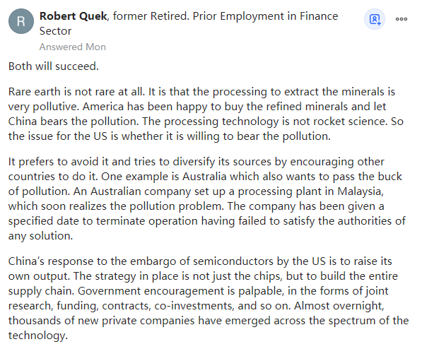 本文譯自Quora,原標題:Which effort is more likely to succeed? China’s effort to overcome semiconductor disadvantage viz US? Or US’ effort to overcome rare earth disadvantage viz China?