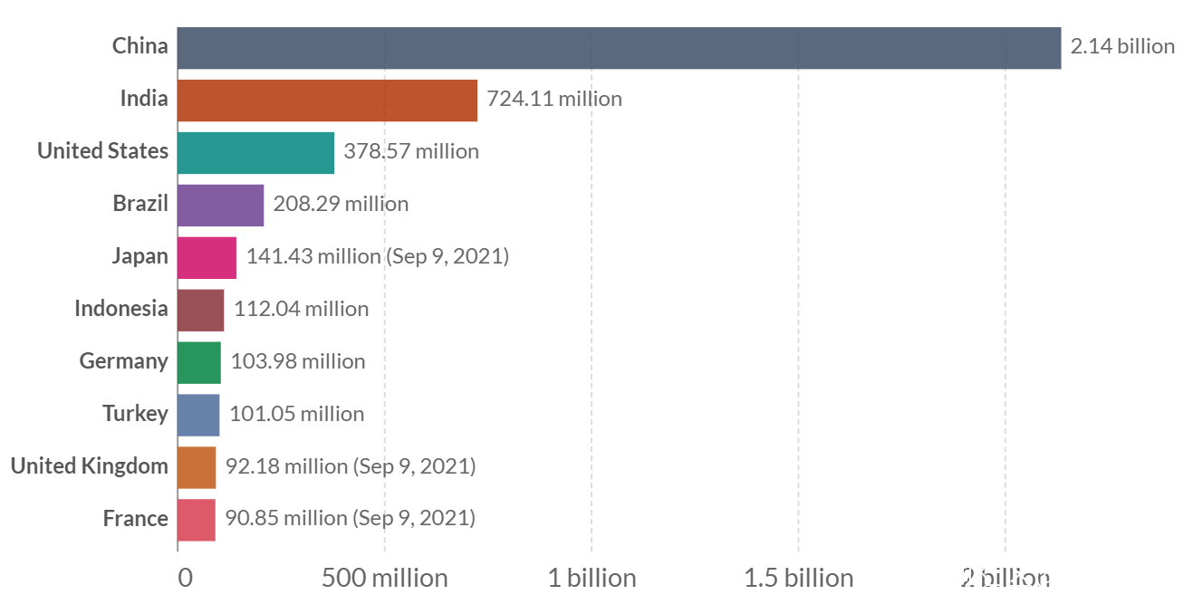 截止2021年9月10日,印度累計接種7.2411****億劑,列第二位,**其中單日新增接種320萬劑。**印度至少接種一劑的人羣佔比為39.7%,完成接種的人羣佔比為12.3%。印度每百人累計接種51.97劑,是中國的34.4%。