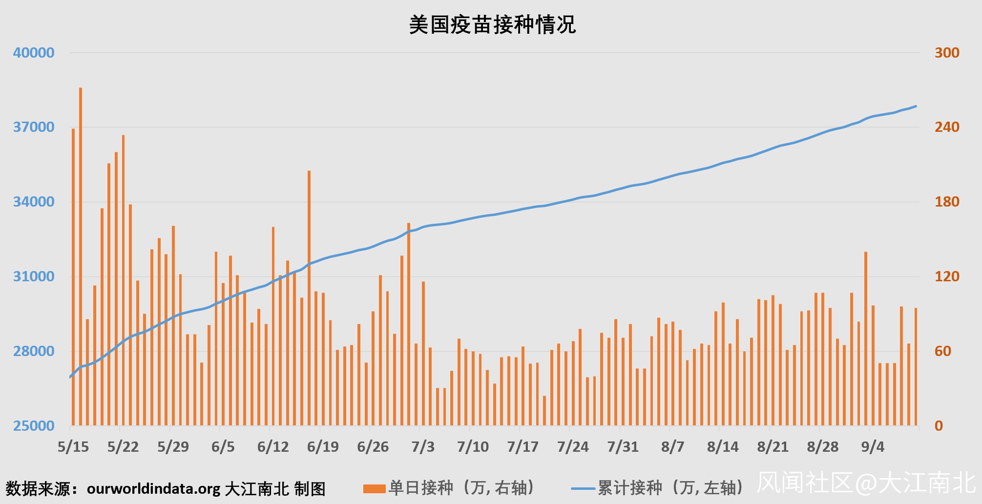 截止2021年9月10日,美國累計接種3.7857億劑,居全球第三位,其中單日新增接種95萬劑,。美國至少接種一劑的人羣佔比為62.0%;完成接種的人羣佔比為52.9%。美國每百人累計接種112.56劑,比中國低38.69劑,是中國的74.4%。