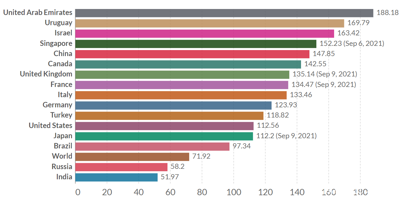**中國排名第一:151.24劑,環比增加0.38劑(**以七普人口為基數);