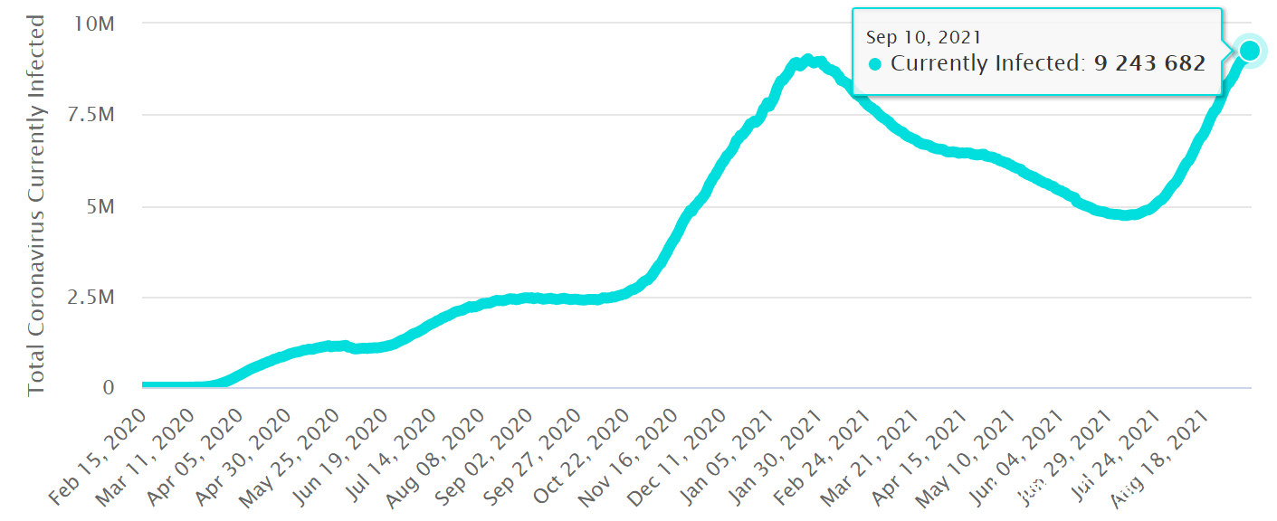 9月10日,全球新增新冠確診597,423例;累計確診2.2462億例;新增病亡9,135例;累計病亡462.99萬例。