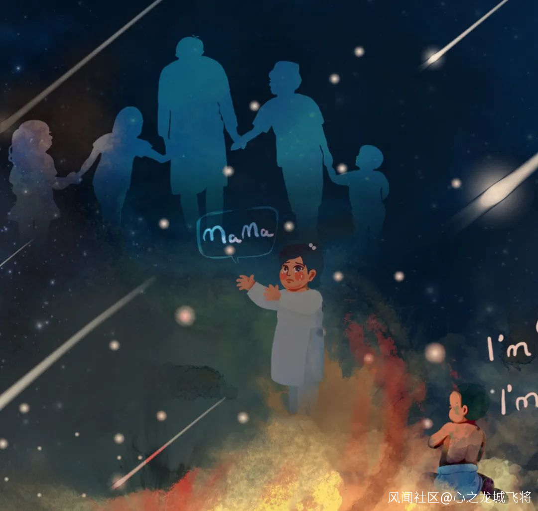 十顆流星,象徵十條生命的隕落。七口棺材,裏面是父母的寶貝。大哥哥與弟弟妹妹手拉着手走向天際,畫面充滿哀傷。
