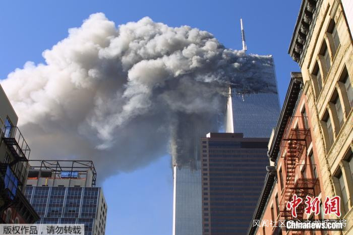 2001年9月11日,美國紐約世貿中心的雙子塔遭被劫持的客機撞擊後,燃起熊熊大火。