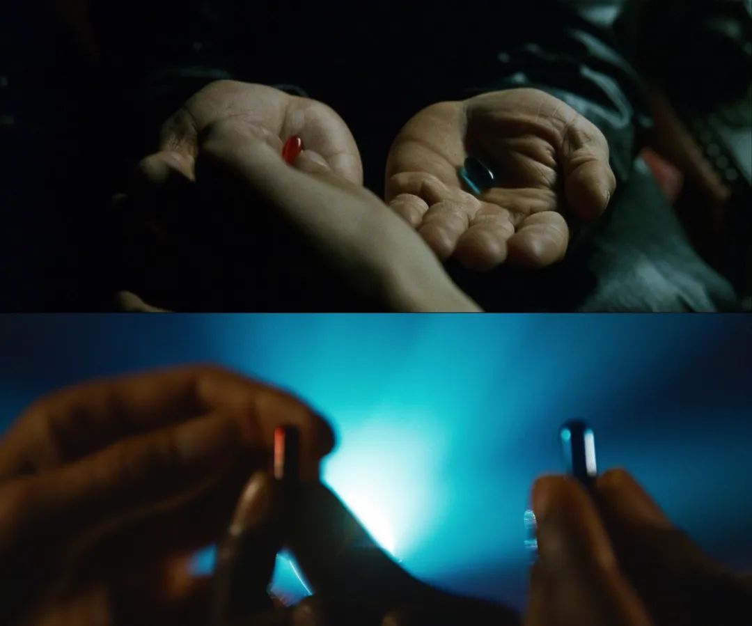 紅藥丸版象徵現實,藍藥丸象徵虛擬。