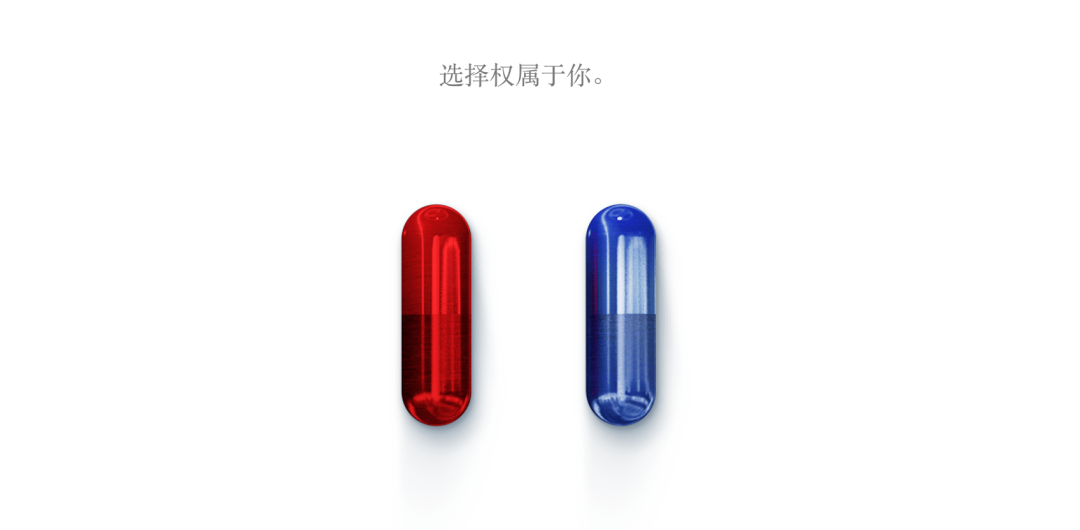 選擇紅色,漫遊仙境,回到現實世界;選擇藍色,繼續過虛擬的生活。