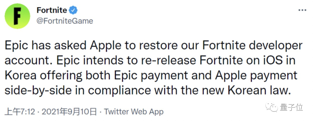 9月10日,Epic Games要求蘋果恢復其《堡壘之夜》開發者賬户,以便在韓國重新發行這款遊戲的iOS版本,提供蘋果和Epic兩套支付渠道。