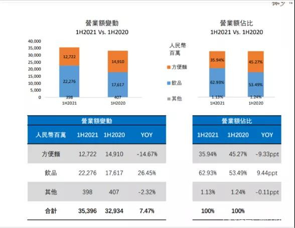 資料顯示,康師傅業務分為方便麪、飲品及其他業務三大部分,除了方便麪和飲品業務外,康師傅在其他業務上的收入同比下降了2.32%。上半年,康師傅集團整體營收353.96億元,同比增長7.47%,因此,可以説是飲品上的營收增長彌補了方便麪業務的營收不足。